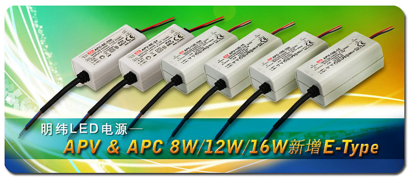 ”APV-8/12/16等系列”以及”APC-8/12/16等系列”,為具有高性價比之經(jīng)濟款低功率LED電源供應(yīng)器(或驅(qū)動器)。明緯現(xiàn)以相同的機殼,新推出了工作於230VAC范圍、具備更高功率因數(shù)、更小空載消耗功率(<0.5W)和更短啟動時間(<500ms)的新產(chǎn)品”APV-8E/12E/16E”以及”APC-8E/12E/16E”等系列。此二系列均提供了2年保固,產(chǎn)品符合CE宣告,且正進行安規(guī)ENEC EN61347等相關(guān)標(biāo)準(zhǔn)的取證(預(yù)計於2016/4取證完成)。產(chǎn)品規(guī)格書已公告於明緯官方網(wǎng)站,如您有任何問題,請與明緯業(yè)務(wù)代表聯(lián)系。