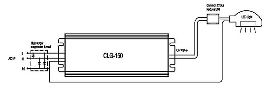 EMI測(cè)試采用電源與LED負(fù)載分離測(cè)試并出具EMC報(bào)告(EN55015/EN55022),如具有FG接地機(jī)型遇有EMI問(wèn)題,建議可先試著將電源本體及LED燈體皆與FG連接,可降低整體EMI噪聲干擾,另外由于輸入及輸出線長(zhǎng)依據(jù)客戶應(yīng)用可能長(zhǎng)達(dá)數(shù)米,其共模噪聲將非常大,建議于靠近LED燈體端加上共模夾扣鐵心可有效降低此噪聲,AC如線長(zhǎng)亦可采此方式對(duì)策(如圖8)。